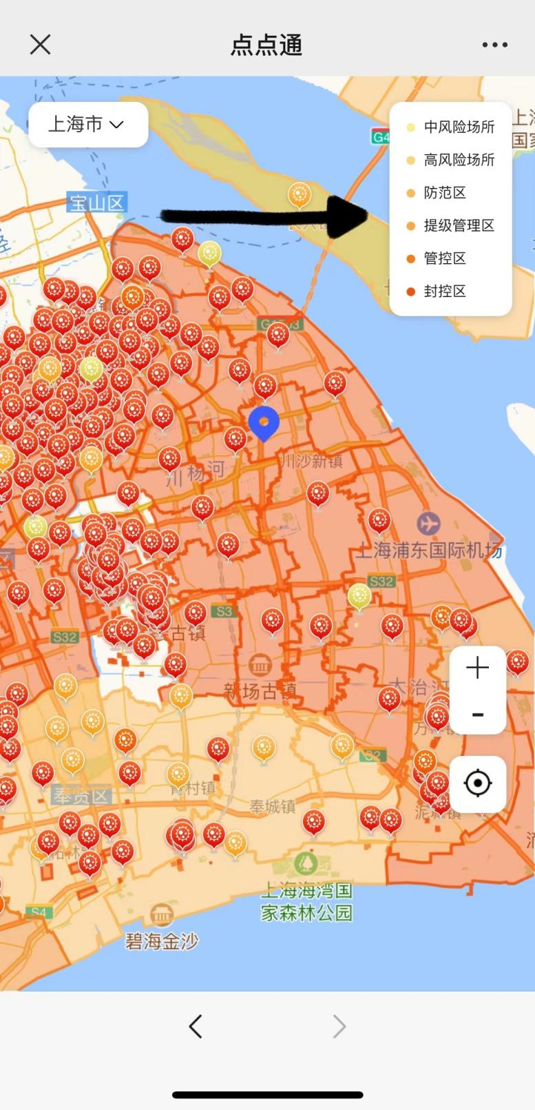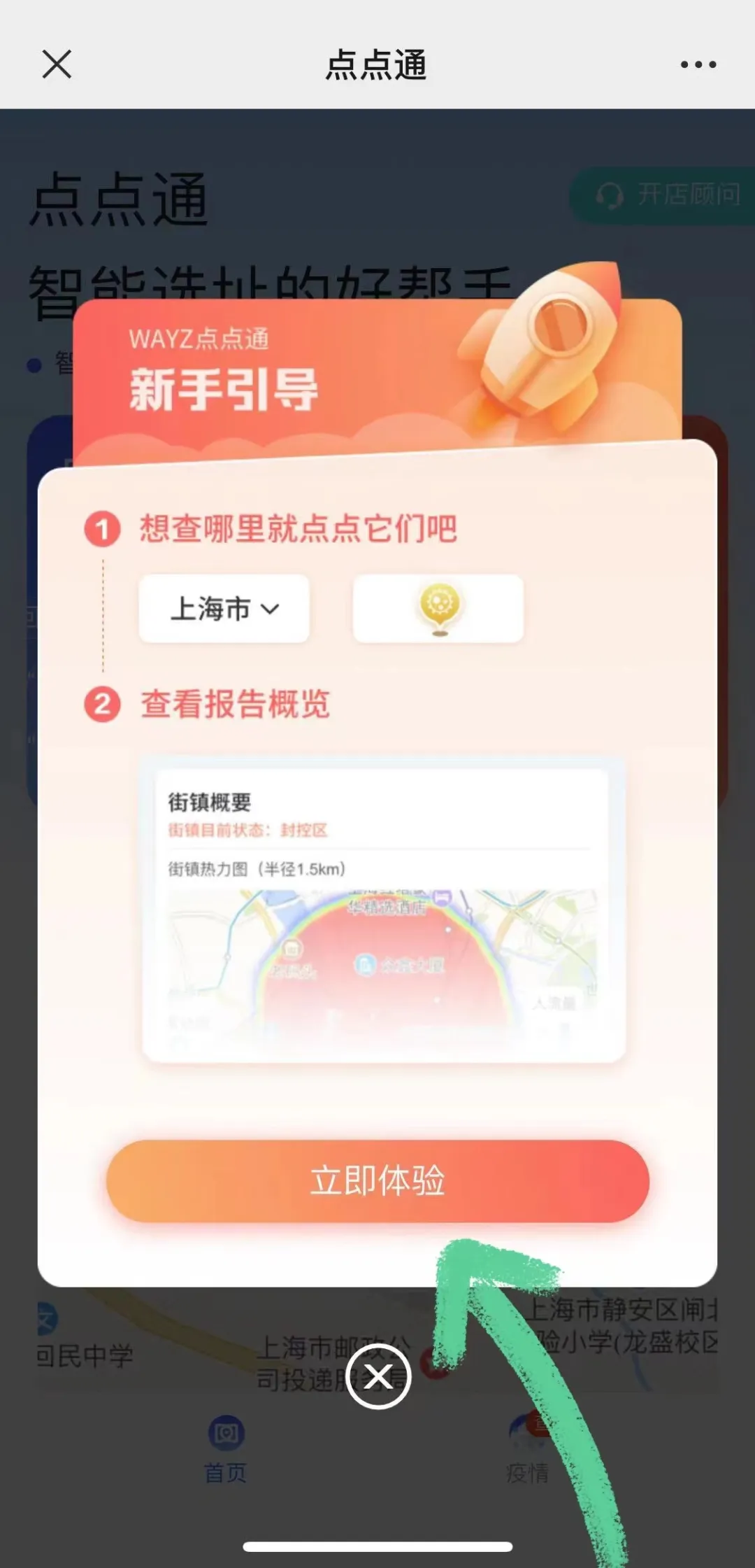 ▲或者跟随新手引导,点击“立即体验”,即可跳转至疫情板块。进入疫情板块后,就可以查看上海各街道的疫情大地图。右上角标注了不同颜色的图例,各街道色块深浅程度表示疫情的风险等级,各街道的边缘线颜色深浅则表示该街道现处的防控区域。开启定位功能可以快速查看想要所在的街道疫情情况,也可以点击左上角进行查询。