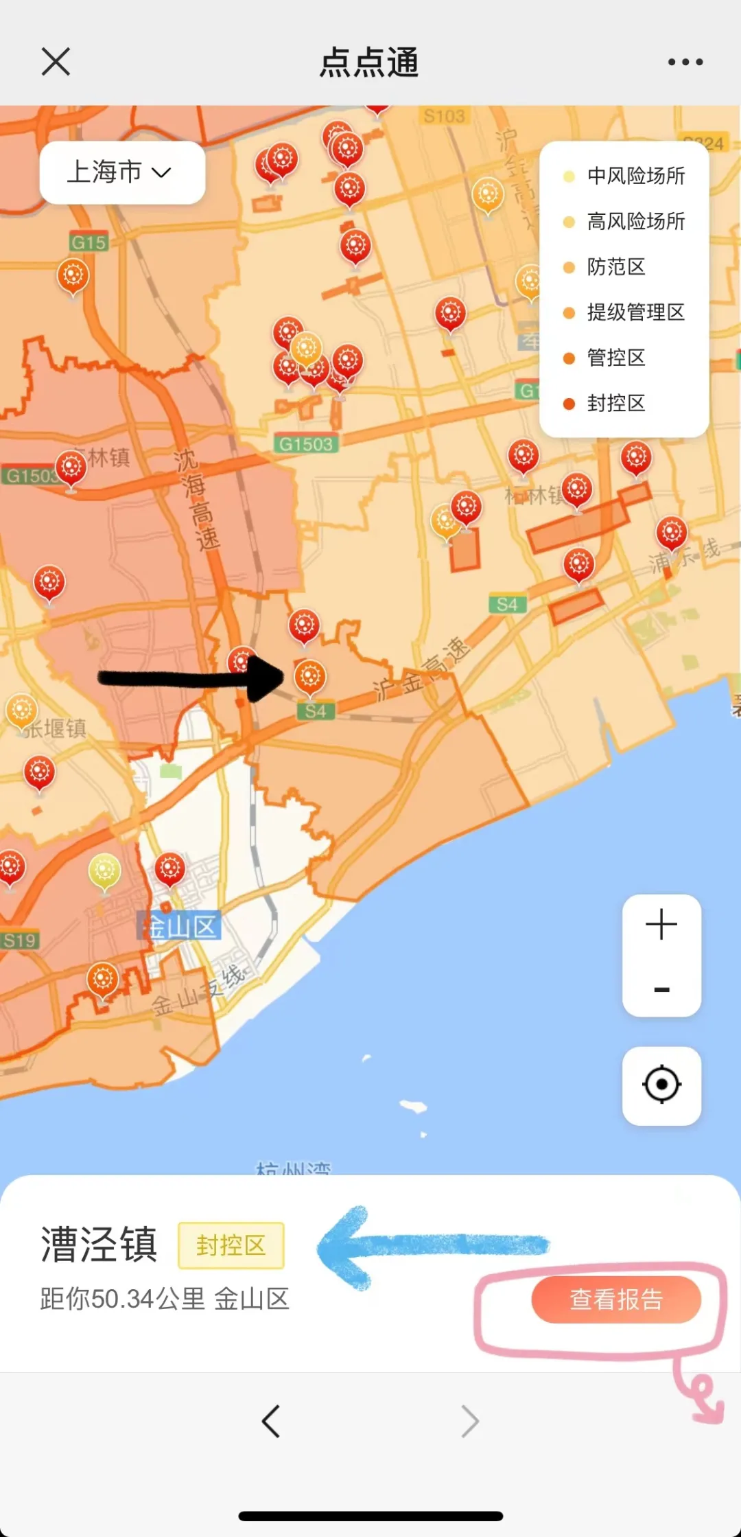 ▲ 街道防控查询点击地图上的小坐标,就能查看街道具体的防控情况。想要进一步了解街道详情,可以点击右下角“查看报告”获取详细的街道报告。