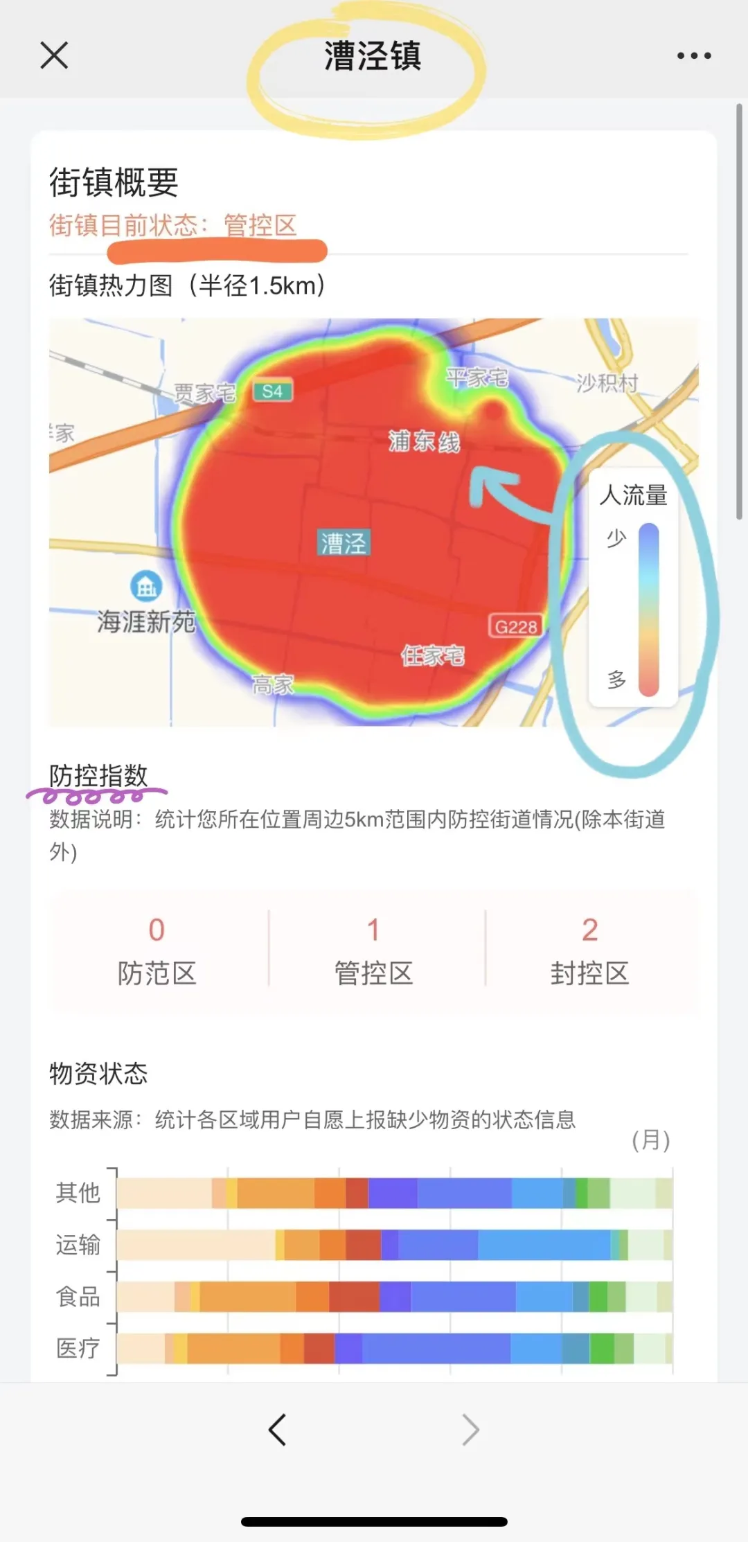 报告详情页面顶端标有查询街道的名称,街镇概要一栏仍然可以查看小区防控的具体状态,而街镇热力图清晰地展示了街镇半径1.5km内的人流量情况,颜色越暖表示人流量越大。防控指数则主要通过除所在区域外5km的周围各区分布,可以了解到相关的辐射街道状况。